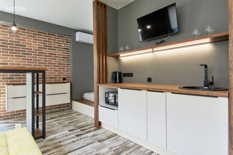 Уютные апартаменты в комплексе бизнес-класса «Моравия». В апартаментах сделан новый дизайнерский ремонт в стиле лофт. Из окон можно любоваться прекрасными пейзажами и морем. Наши апартаменты - это продуманное до мелочей место для Вашего отдыха. Вас ждёт welcome-набор: чай, кофе, сахар, сладости, 2 бутылочки воды. В апартаментах есть соль, бутылочка подсолнечного масла, шампунь, гель для душа, жидкое мыло, средство для мытья посуды, стиральный порошок. В апартаментах имеется все для Вашего удобства: стиральная машина, кондиционер, телевизор, электрическая однокомфорочная плитка, чайник, микроволновая печь, гладильная доска, утюг, фен. На территории апартаментного комплекса 2 магазина, несколько детских площадок, спортивные тренажеры, футбольная и волейбольная площадка. На эксплуатируемой кровле можно загорать и любоваться морским пейзажем. Есть возможность воспользоваться парковочным местом на территории комплекса за отдельную плату.Расстояние до моря 1 км.